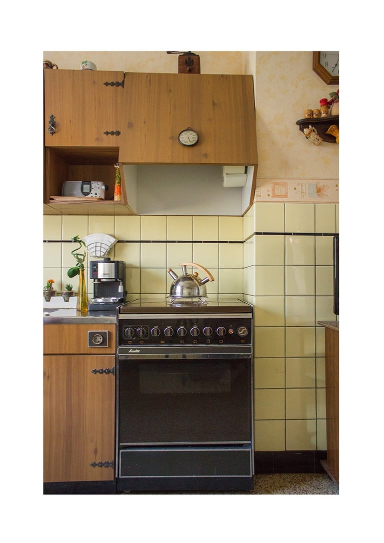« Portraits de famille » se déploie en une série de seize photographies qui capturent l’essence intime de deux maisons imprégnées d’histoires personnelles. À travers un cadrage frontal délibérément évocateur du portrait en pied traditionnel, ces images révèlent des fragments d’intérieurs quotidiens transformés en compositions visuelles singulières.