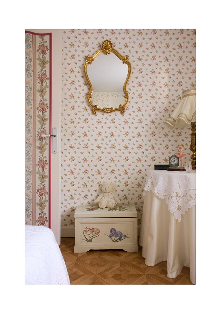 Les deux habitats se distinguent par leurs signatures esthétiques profondément différentes. La première maison se caractérise par ses tons chauds et l’omniprésence de papiers peints à motifs, notamment des toiles de Jouy aux teintes roses qui tapissent les murs et créent une ambiance chargée d’ornements et d’histoire. La seconde présente une palette plus retenue, oscillant entre bleus discrets et beiges apaisants, meublée de pièces aux lignes épurées d’inspiration scandinave. Ces meubles d’époque racontent silencieusement des décennies de vie et incarnent une élégance intemporelle.