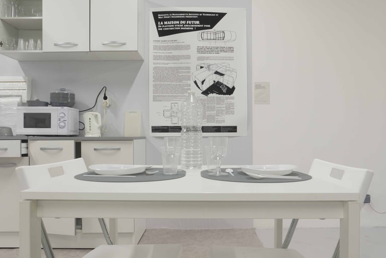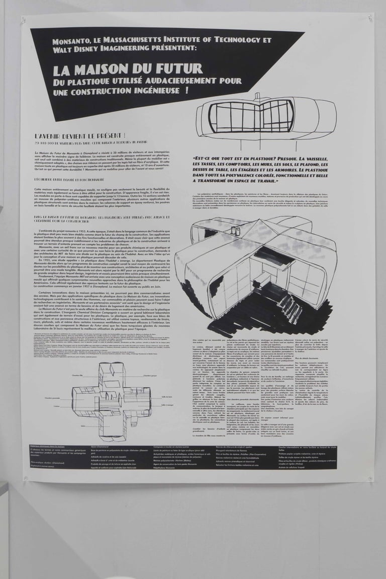 L’installation établit un dialogue critique avec « La maison du futur» de Monsanto et du MIT à travers une affiche intégrée à l’œuvre, reconstituant une publicité d’époque de cette habitation entièrement conçue en plastique qui fut exposée de 1957 à 1967 à Disneyland Tomorrowland. Ce visuel promotionnel vintage, placé au cœur de l’installation, rappelle les promesses technologiques qui entouraient ce prototype architectural, lequel apparaît aujourd’hui comme une aberration au regard des impératifs écologiques contemporains.